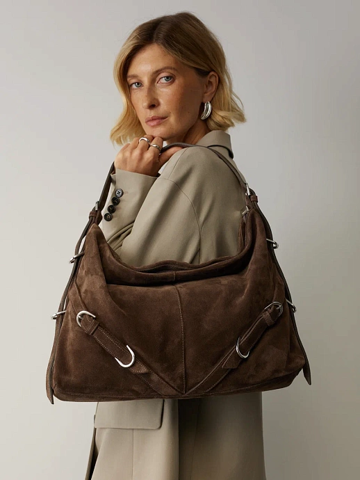 Акцент на декоративные элементы и вместительность - отличительные черты хобо AFINA №739. Мягкость натуральной замши, фирменная фурнитура, тиснение с логотипом бренда на дне и функциональный карман на